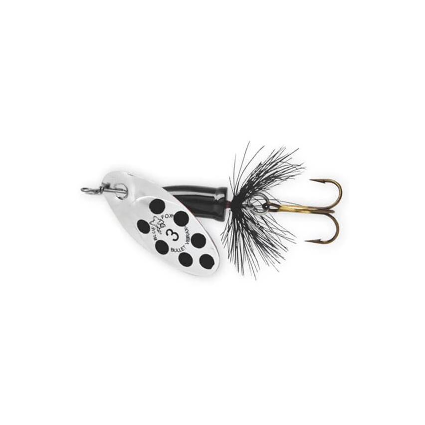 With 30% more weight than the Vibrax® Original, the Vibrax® Bullet Fly has been specifically engineered to fish faster running, deeper waters. It’s inline blade spins directly on the shaft in a wider arc for maximum vibration. A dressed tail gives added life-like attraction. The patented two-part body, which virtually eliminates line twist is really what sets all Blue Fox spinners apart. Whether casting for still water predators such as perch and chub, or working fast moving rivers for trout and salmon, this low-frequency spinner is going to create the noise and vibration required to trigger a strike.
