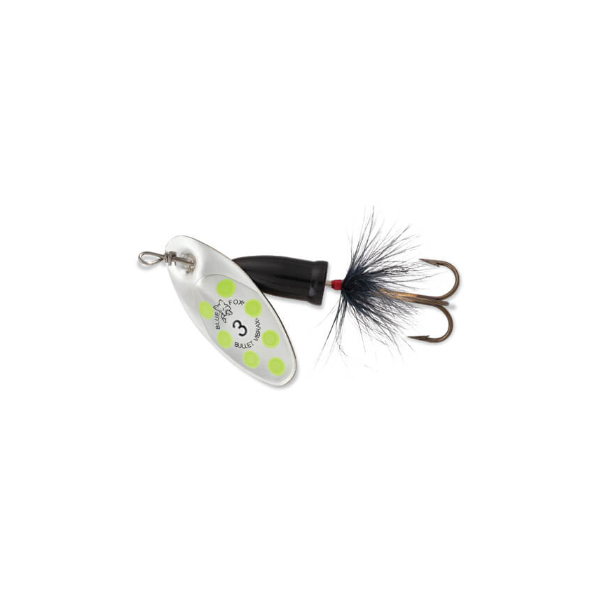 With 30% more weight than the Vibrax® Original, the Vibrax® Bullet Fly has been specifically engineered to fish faster running, deeper waters. It’s inline blade spins directly on the shaft in a wider arc for maximum vibration. A dressed tail gives added life-like attraction. The patented two-part body, which virtually eliminates line twist is really what sets all Blue Fox spinners apart. Whether casting for still water predators such as perch and chub, or working fast moving rivers for trout and salmon, this low-frequency spinner is going to create the noise and vibration required to trigger a strike.