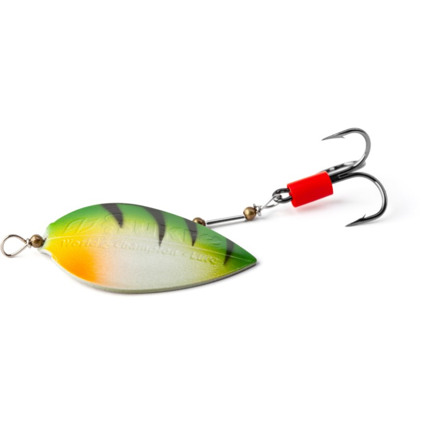 Тело спиннера изготавливается из толстого металла (толщиной 1 мм) без дополнительного груза. Хвост блесны работает даже при остановке, а во время падения она движется из стороны в сторону и поэтому может использоваться на любой глубине.