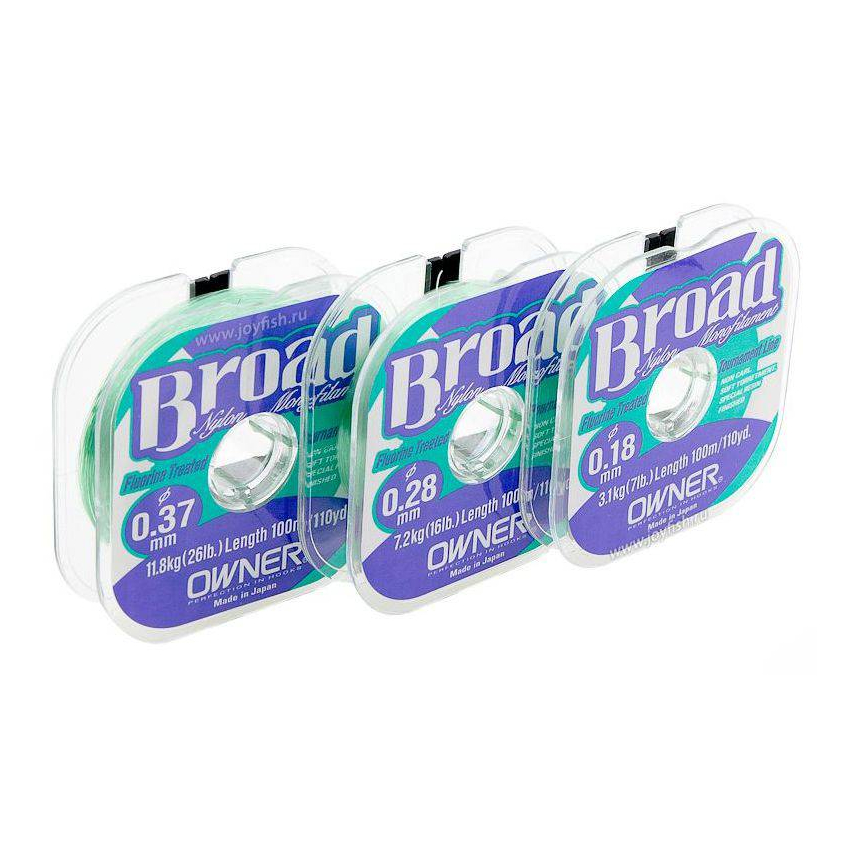 Owner Broad – универсальная монофильная леска, с успехом использующаяся для любых видов ловли: спиннинговой, поплавочной, фидерной, морской, зимней и т.д. Леска Owner Broad имеет светло-зеленый цвет и незаметна в воде. Она очень эластичная, практически не имеет памяти, хорошо держит узлы, калибрована по всей длине, строго соответствует заявленным тестовым нагрузкам и диаметру.