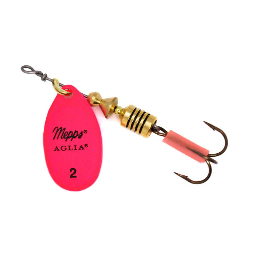 Mepps Aglia Fluo оснащена лепестками с очень яркой матовой окраской, дающей преимущество при ловле в темное время суток, на большой глубине и в мутной воде. Все они изменяются более или менее значительно, а некоторые вообще становятся неузнаваемы. Например, розовый (Pink) приобретает ярко-голубой оттенок, кроме того окраска вращающегося лепестка в воде кажется несколько мягче, чем в воздушной среде, при солнечном освещении. Лепестки Fluo хорошо видны даже при освещении ультрафиолетовыми лучами, доходящими до самых больших глубин. Стимулированные ультрафиолетом, они продолжают долго светиться, даже когда другие цвета полностью исчезают из виду. Кроме глубины, эти приманки очень хороши в мутной воде и при пасмурной погоде.