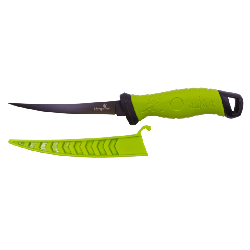 Филейный нож из нержавеющнй стали с тефлоновым покрытием. Нож имеет удобную, нескользящую рукоять из термопластичной резины TPR и чехол для защиты при хранении. Ножны имеют отверстия, благодаря которым вода не скапливается в них и не дает ржаветь клинку.На рукояти ножа имеются отверсия для крепления страховочного тросика. Пластиковый чехол для хранения оснащен специальным выступающей защелкой, предотвращающим выпадение ножа из чехла.