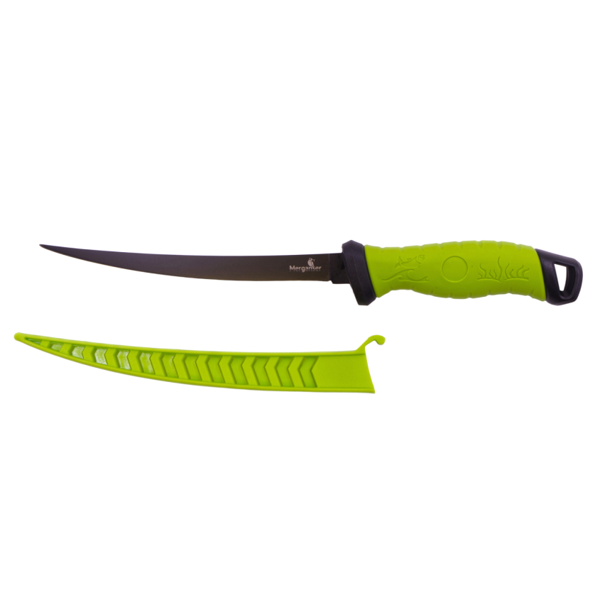 Филейный нож из нержавеющнй стали с тефлоновым покрытием. Нож имеет удобную, нескользящую рукоять из термопластичной резины TPR и чехол для защиты при хранении. Ножны имеют отверстия, благодаря которым вода не скапливается в них и не дает ржаветь клинку.На рукояти ножа имеются отверсия для крепления страховочного тросика. Пластиковый чехол для хранения оснащен специальным выступающей защелкой, предотвращающим выпадение ножа из чехла.