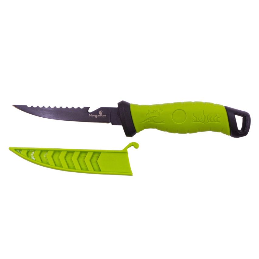 Универсальный нож из нержавеющнй стали с тефлоновым покрытием. Нож имеет удобную, нескользящую рукоять из термопластичной резины TPR и чехол для защиты при хранении. Ножны имеют отверстия, благодаря которым вода не скапливается в них и не дает ржаветь клинку.На рукояти ножа имеются отверсия для крепления страховочного тросика. Лезвие имеет резак для лески или веревки и специальную кромку для очистки рыбы или резки костей. Пластиковый чехол для хранения оснащен специальным выступающей защелкой, предотвращающим выпадение ножа из чехла.