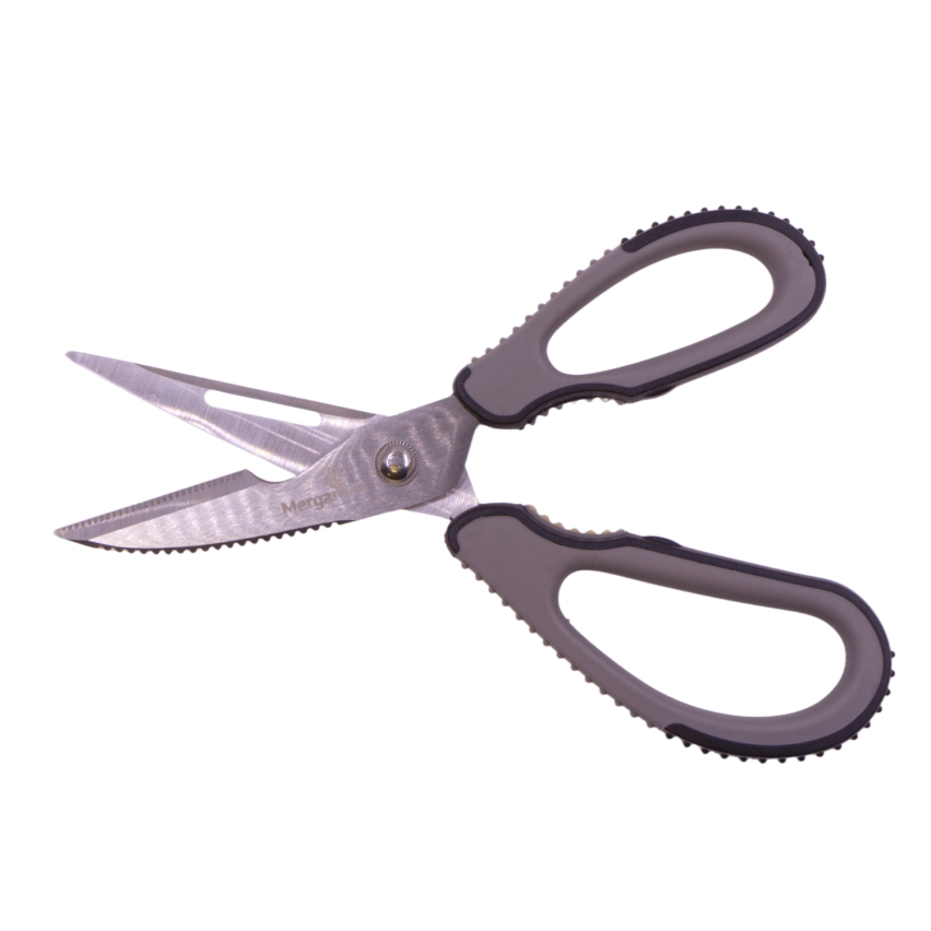 Мультифункциональные разборные ножницы, сделанные из прочной нержавеющей стали, которые позволяют легко разделать рыбу, курицу, мясо. Увеличенная рукоятка идеально подходит для работы в перчатках. Состоят из прямого и зубчатого ножа (рыбочистка). Разборная конструкция позволяет их легко очистить после работы.