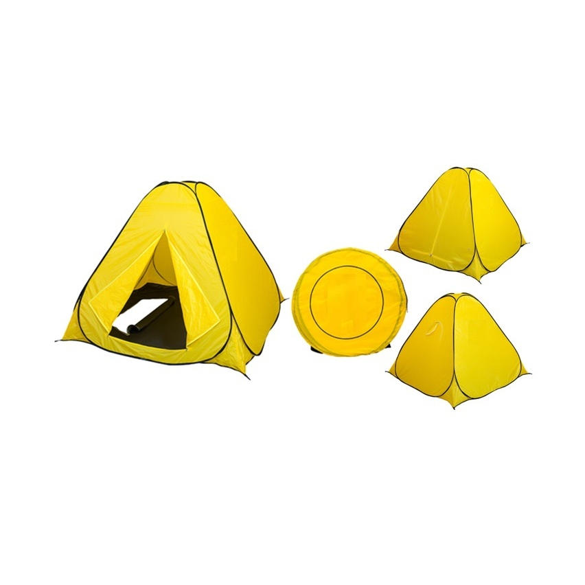 Удобная практичная самораскрывающаяся палатка . Может применяться как зимой так и летом. Основное отличие от других зимних палаток, это закрытое дно, в котором сбоку на молнии отстегивается отверстие 50х130 см. Вход с растегивающейся молнией. С противоположной стороны есть небольшое закрывающееся окно на молнии. Время на операцию "собрать и разобрать эту палатку" составляет несколько минут. Тент палатки по всем сторонам пришит к упругому каркасу из гибких металлических прутьев, который при переводе в транспортное положении несколькими движениями сворачивается в плоский круг, который мгновенно распрямляется под действием каркаса-пружины после того, как палатка вновь вынимается из чехла. Плюсы - малый вес (2,8 кг.) и быстрота развертывания и свертывания при определенном навыке; наличие дна, а также низкая цена. Эта палатка может служить укрытием от ветра даже безо всяких дополнительных растяжек, так как рыболов сидит на ёё "полу" и своим весом обеспечивает устойчивость палатки. Удобная упаковка, удобные наплечные ручки. В комплект входят колышки для крепления на грунте.