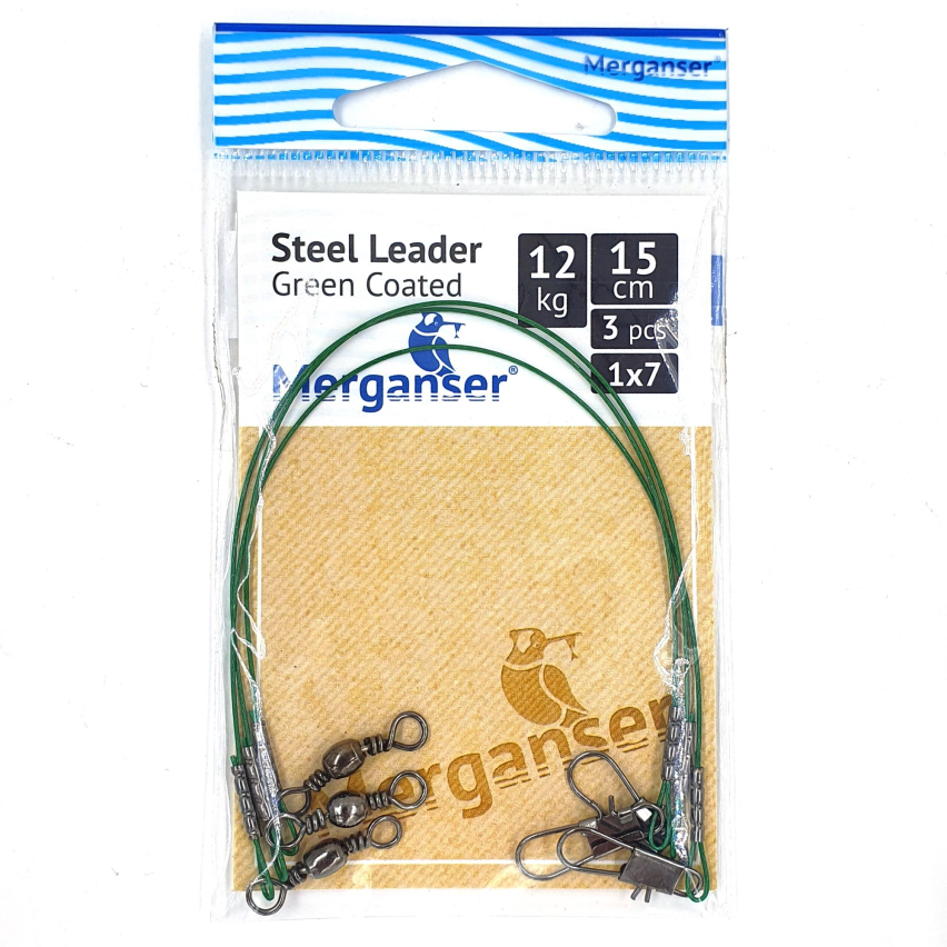 Поводок Merganser стальной, 1x7 с зелёным покрытием, 12 кг, 15 см, 3 шт