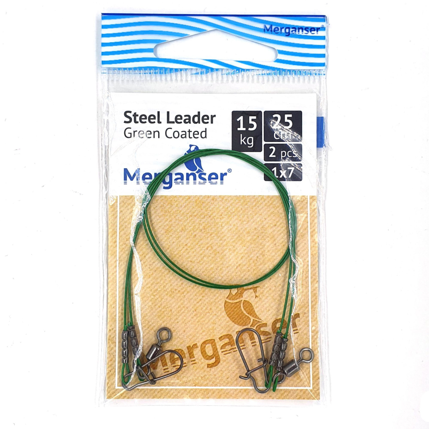 Поводок Merganser стальной, 1x7 с зелёным покрытием, 15 кг, 25 см, 2 шт