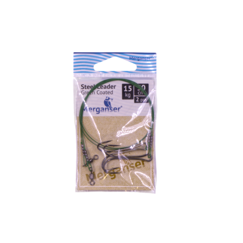 Поводок Merganser стальной, 1x7 с зелёным покрытием, 15 кг, 30 см + вертлюг & двойник #1/0, 2 шт