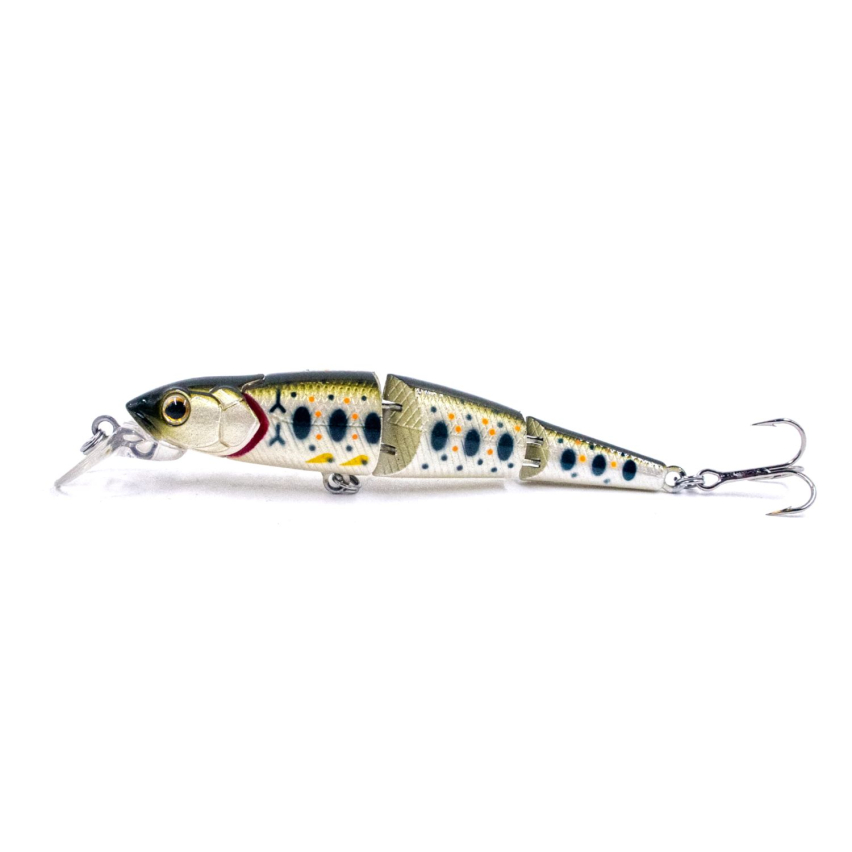 Составной воблер Strike Pro Flying Fish Joint 110 имеет вытянутое узкое тело, соостоящее из нескольких сегментов, скрепленных между собой фирменным соединением “велосипедная цепь”. Такое соединение делает тело воблера очень подвижным, в то же время очень прочным. На голове приманки имеются выпуклые жабры с глубокими полостями, что дает большое количество турбулентных завихрений от воблера во время проводки. Приманка оснащена небольшой изящной лопаткой, расположенной под углом около 45 градусов. На ней расположено колечко для крепления лески. Основная огрузка воблера расположена в переднем сегменте. В среднем сегменте находится среднечастотная погремушка с пластиковыми шариками.