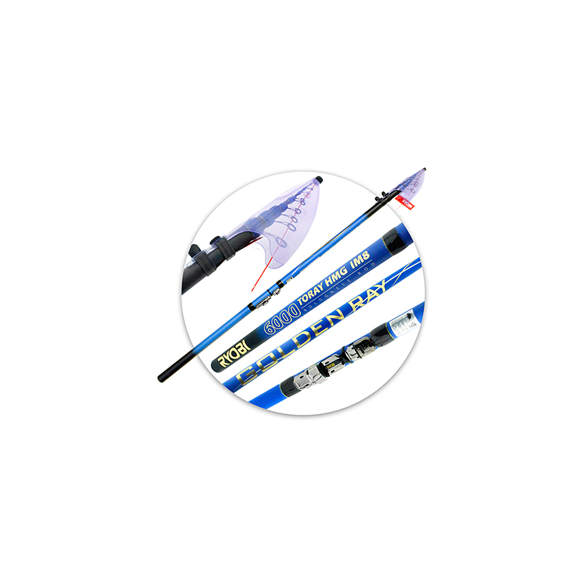 Ryobi GOLDEN RAY - это телескопическое болонское удилище, изготовленное из высокомодульного карбона от Японской компании TORAY. Удилище оснащено легкими пропускными кольцами со вставками SIC, легким и надежным катушкодержателем, и удобным защитным колпачком.
